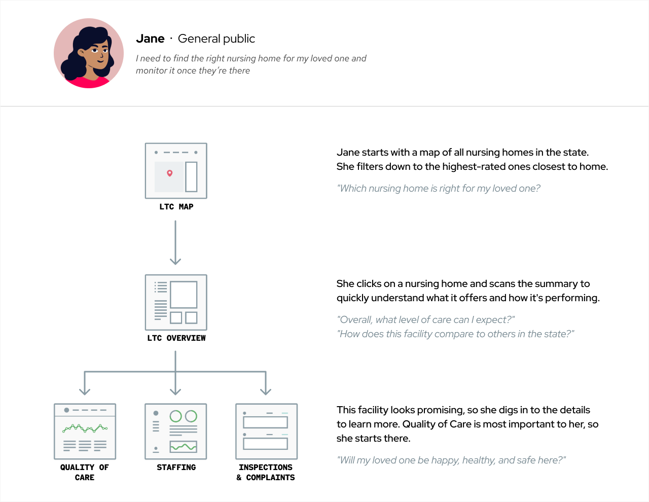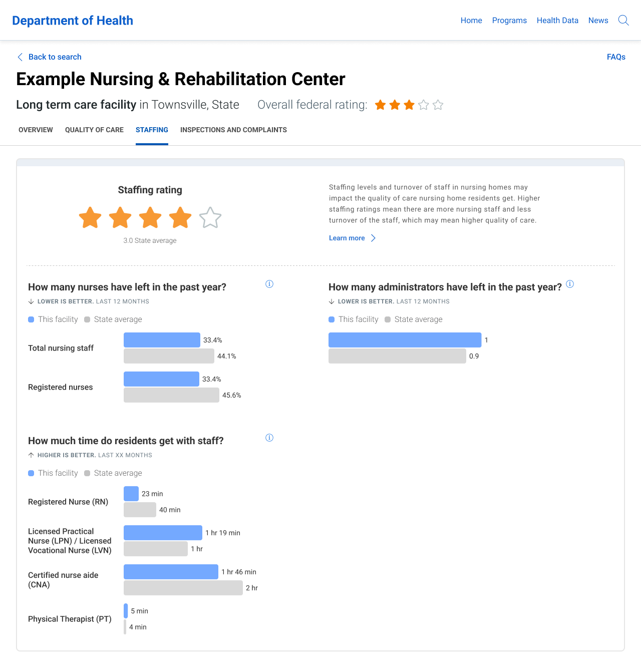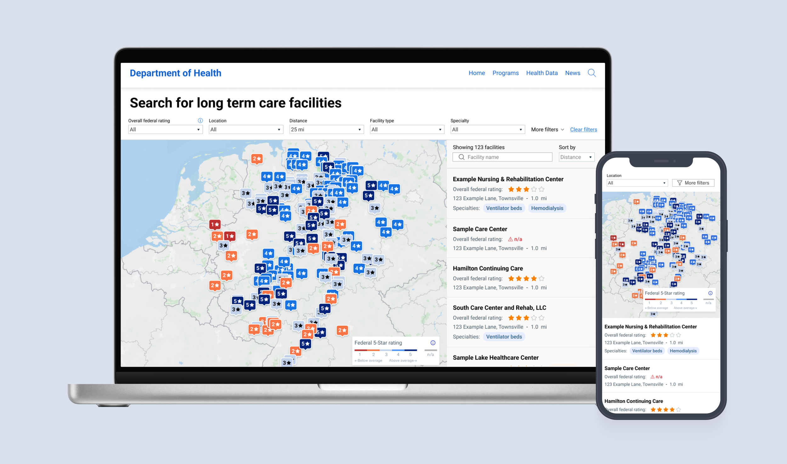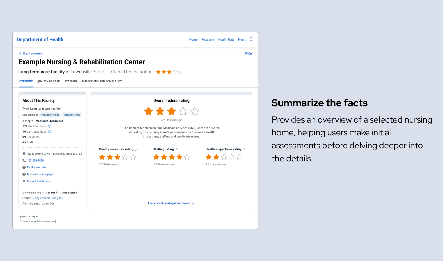 We worked with a state Department of Health to simplify access to nursing home data for both the general public and DoH employees. Multiple data sources without a single source of truth made it challenging to monitor quality of care in nursing homes. Our goal was to create user-friendly platforms that would empower residents, advocates, and stakeholders to make informed decisions about nursing homes.